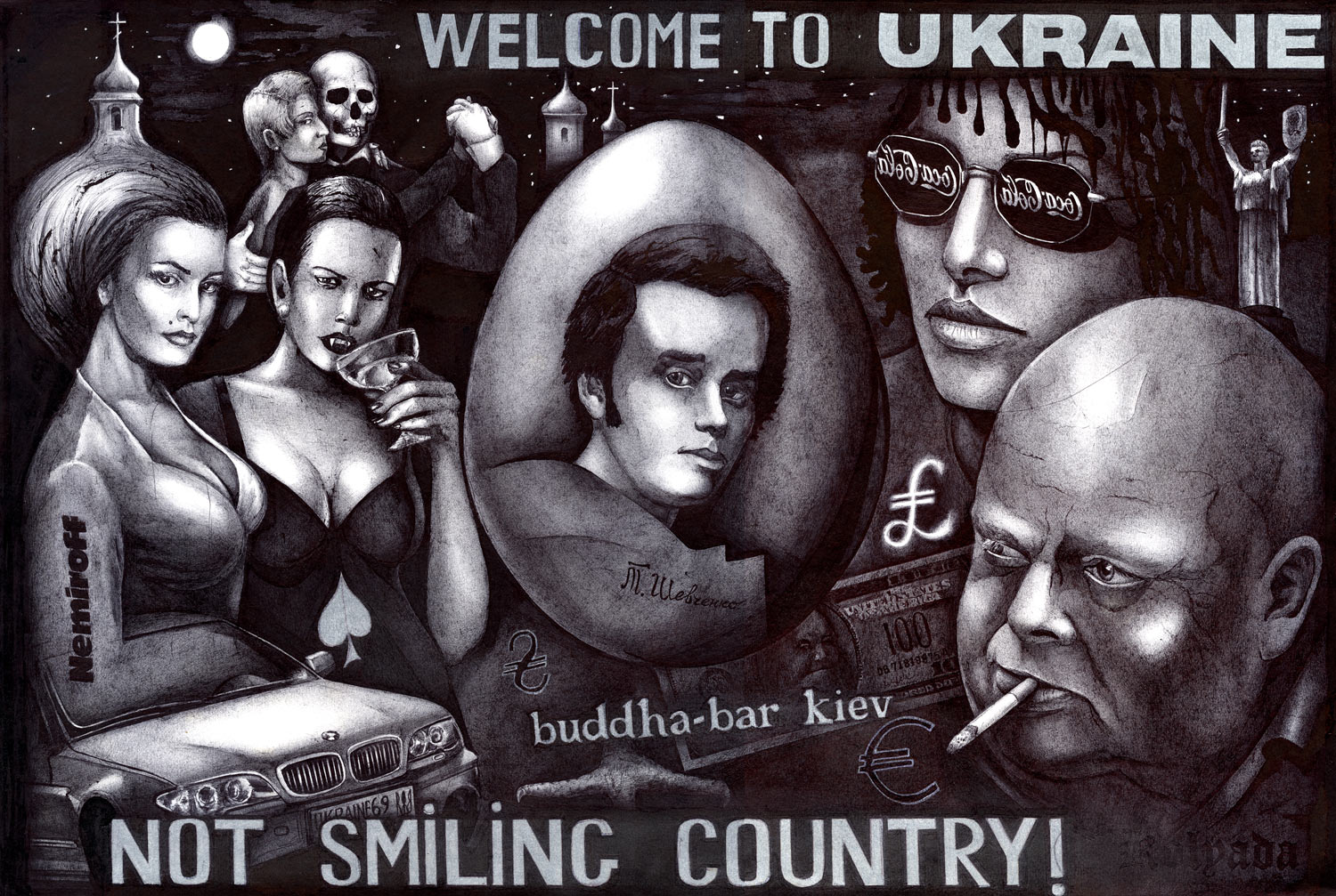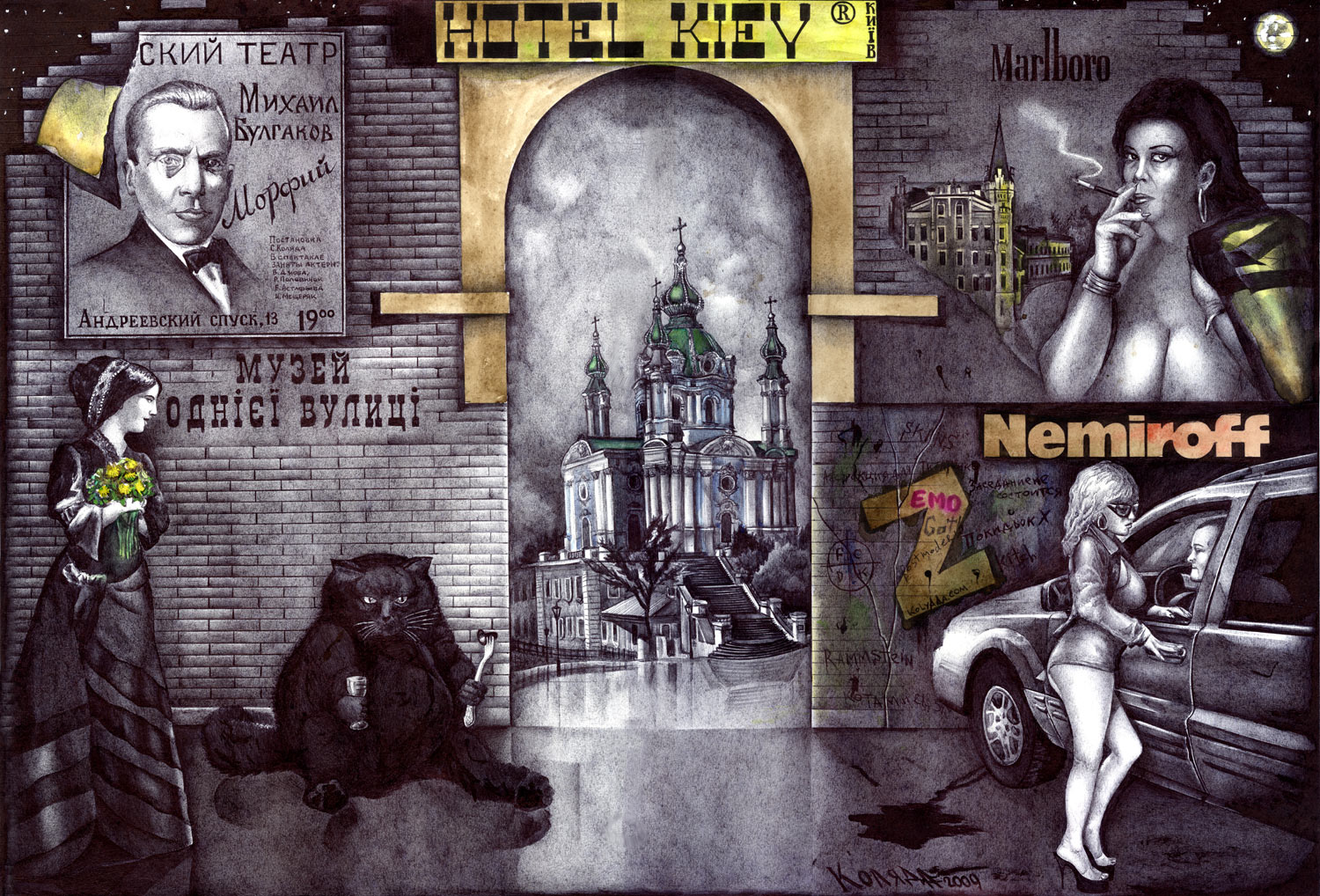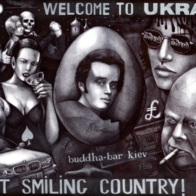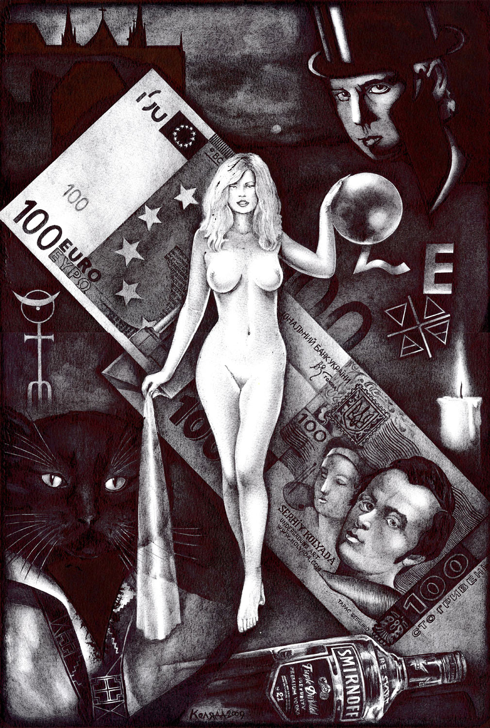 Serhiy Kolyadaは、キエフを影と憂鬱の中に描き、キエフではその活動開始時より苦境に立たされた。彼のサイト(www.kolyada.com)で、暗い背景の企業スローガンに対比して描かれている、裸婦・半裸婦の作品を見よ。彼の芸術は社会的主張である。ウクライナにおける、金、力、性(ジェンダー)問題の強烈な反映。