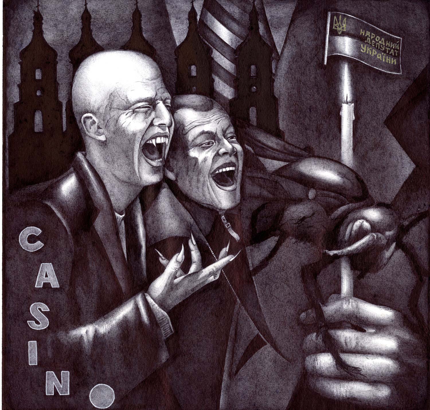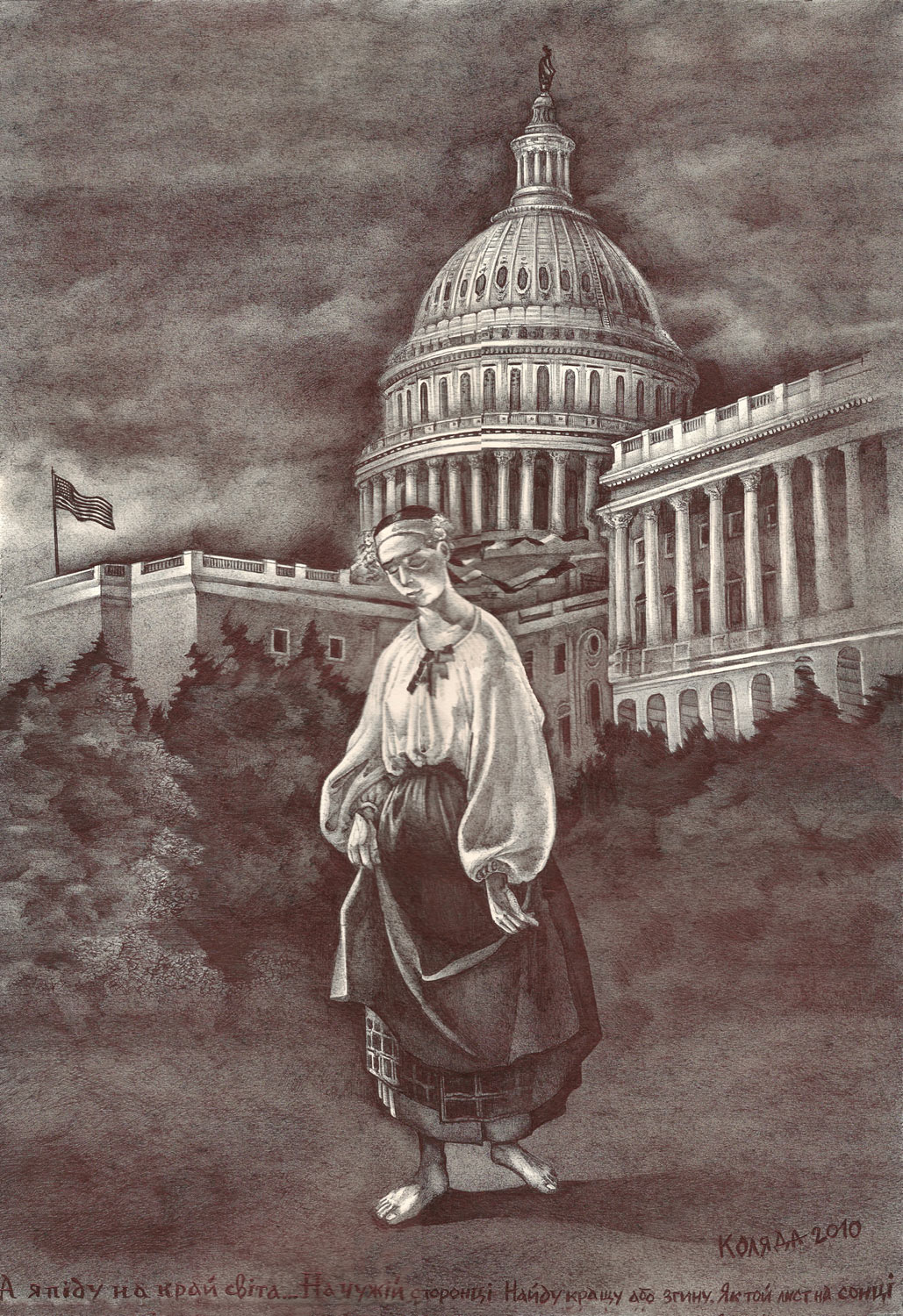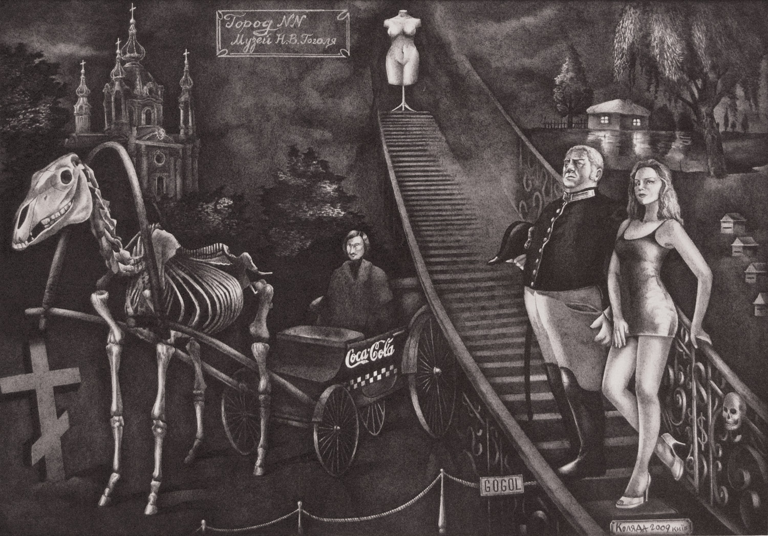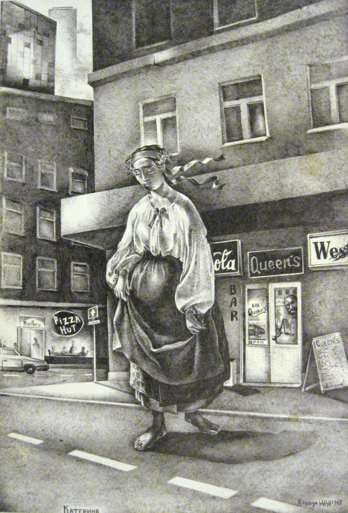 Serhiy Kolyadaは、キエフを影と憂鬱の中に描き、キエフではその活動開始時より苦境に立たされた。彼のサイト(www.kolyada.com)で、暗い背景の企業スローガンに対比して描かれている、裸婦・半裸婦の作品を見よ。彼の芸術は社会的主張である。ウクライナにおける、金、力、性(ジェンダー)問題の強烈な反映。