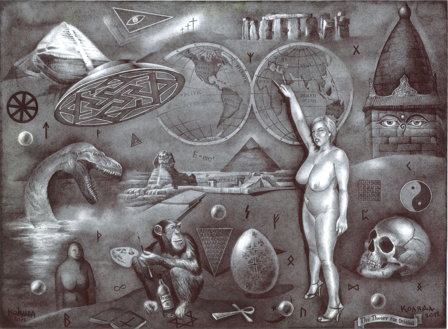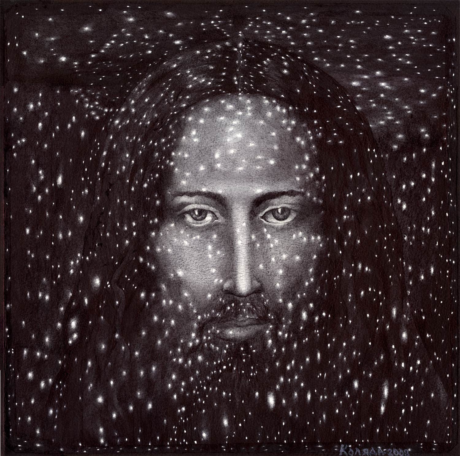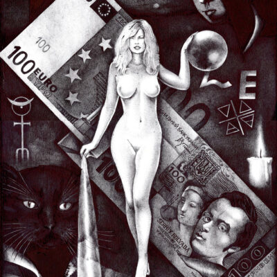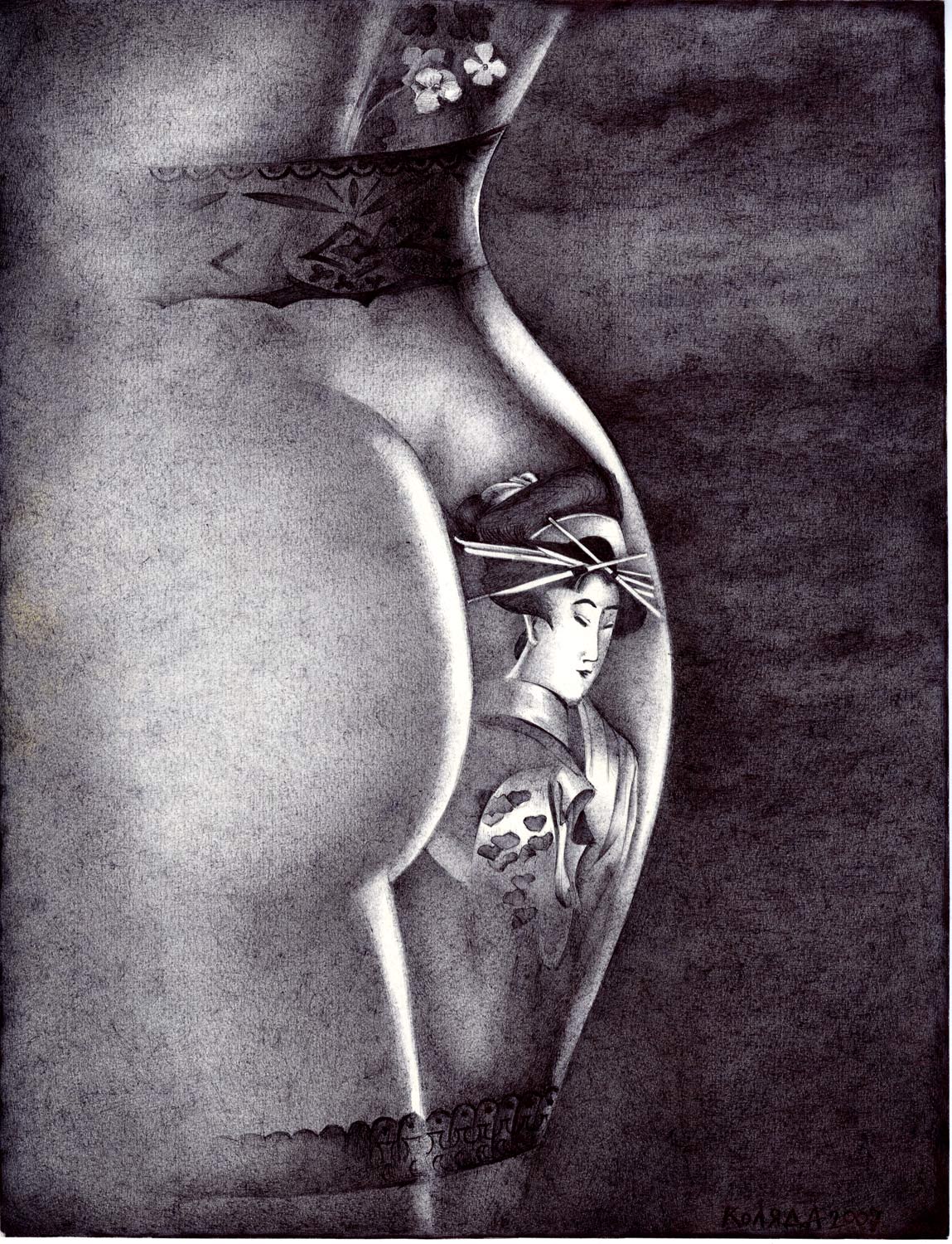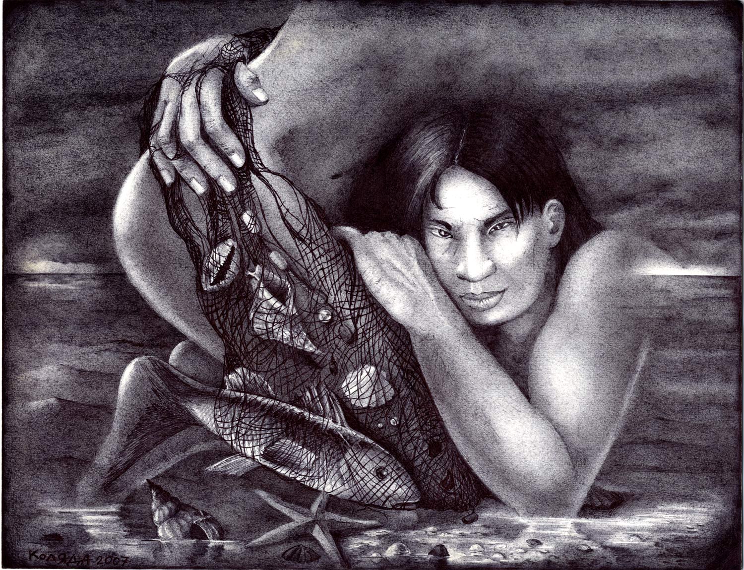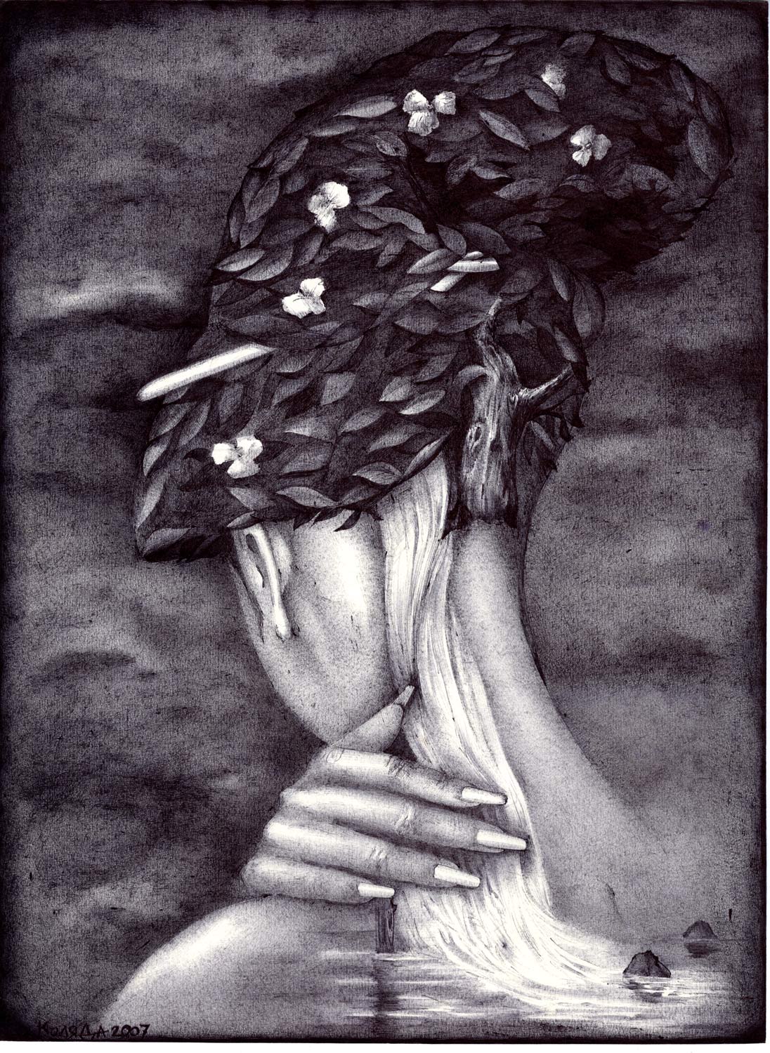 …Serhiy Kolyadaの政治的なボールペン画描は、彼の故国ウクライナのギャラリーから疎外されてきた。彼の作品は、主に英語圏のメディアを通して注目され、ほとんどの販売は、サイトの個人閲覧や、オンライン・ギャラリーなどを通した、外国の顧客が中心である。 … Kolyadaの作品では、色を加えるために他の技法を使うこともあるが、主に黒色のボールペンが使われる。2006年には、宗教的なテーマと「生命の神秘的な側面」が彼の主題となった。