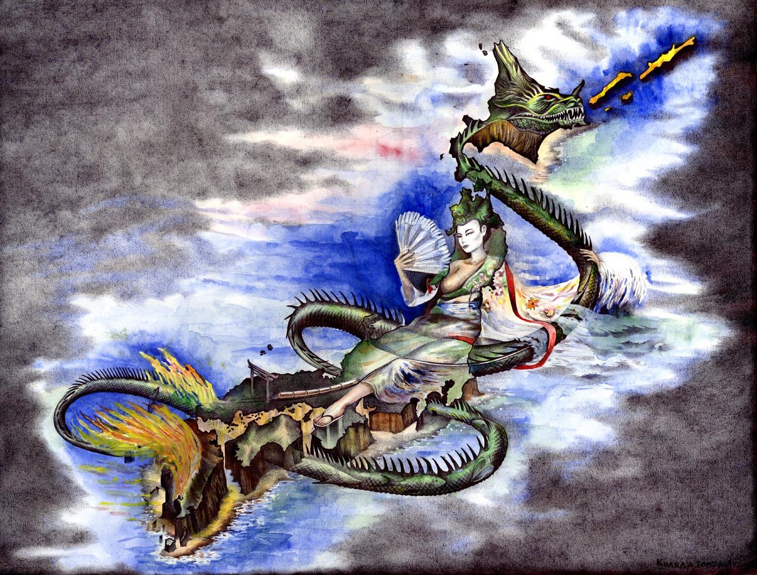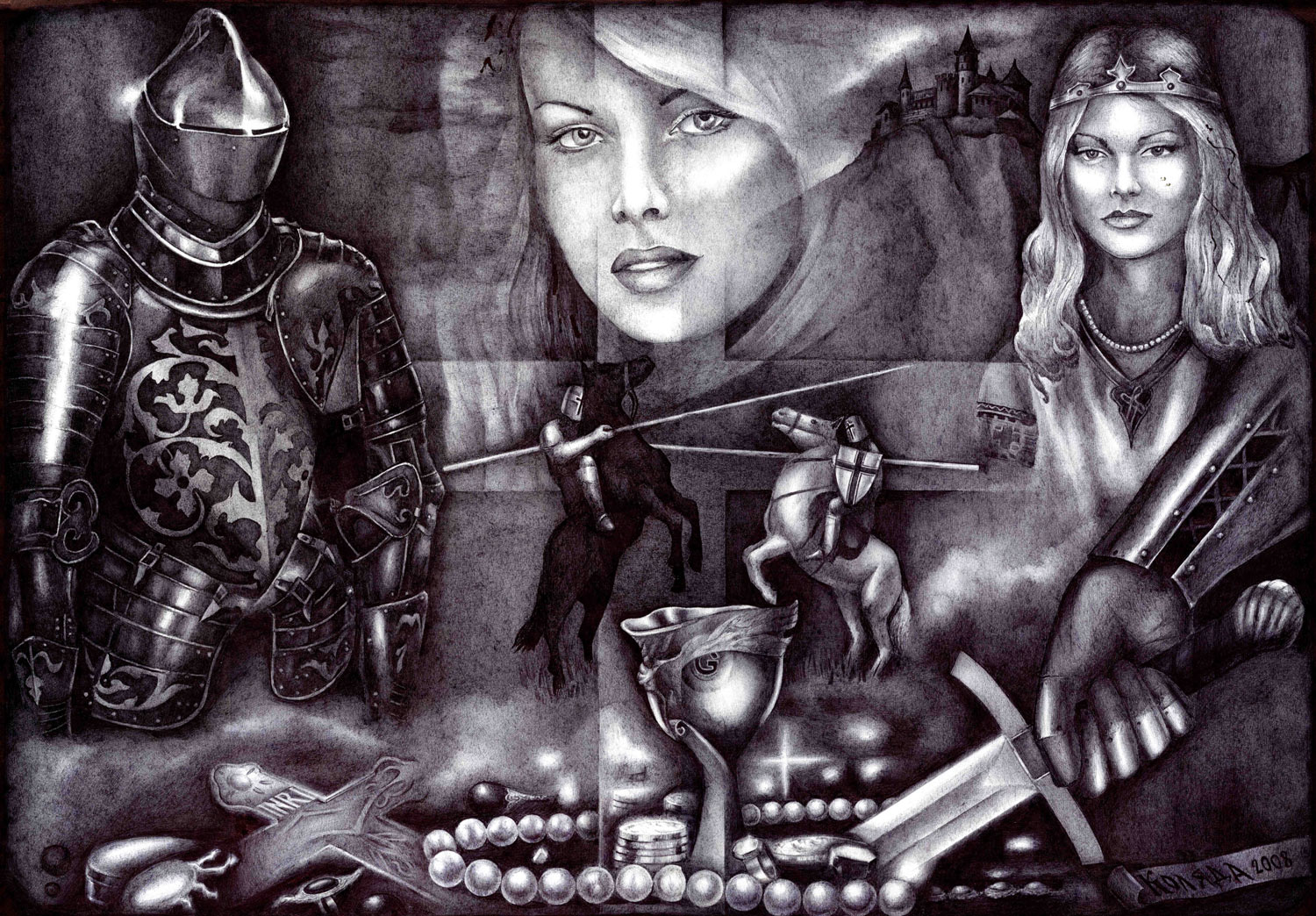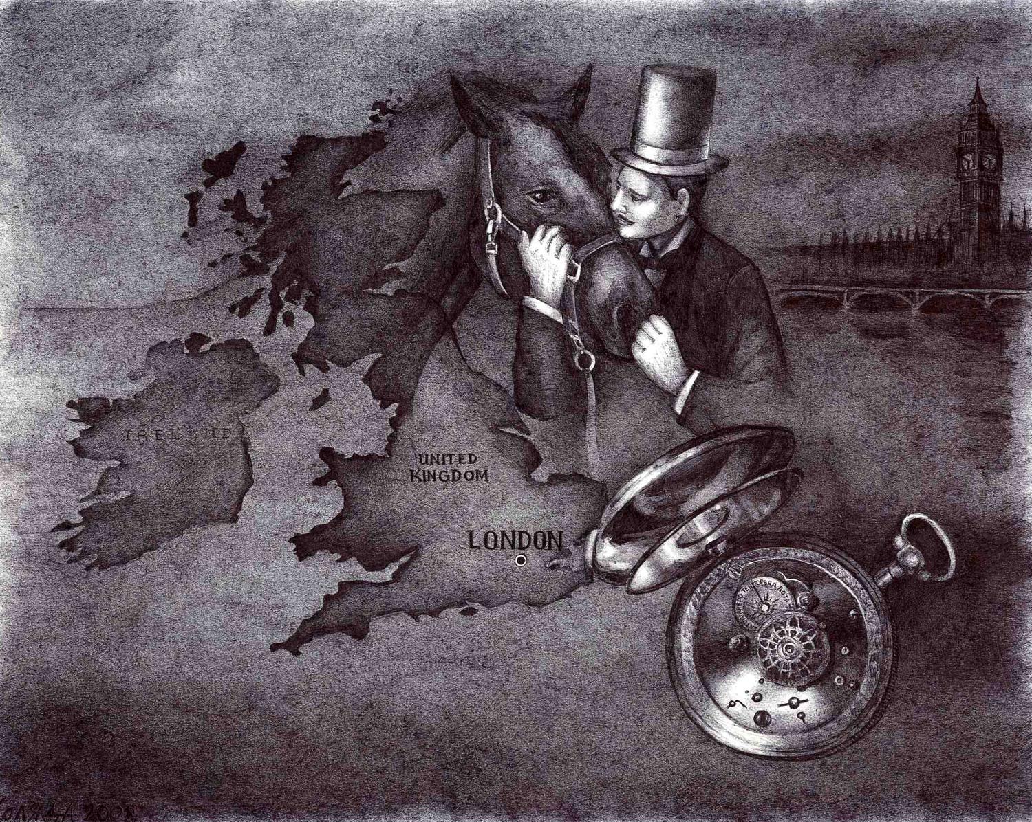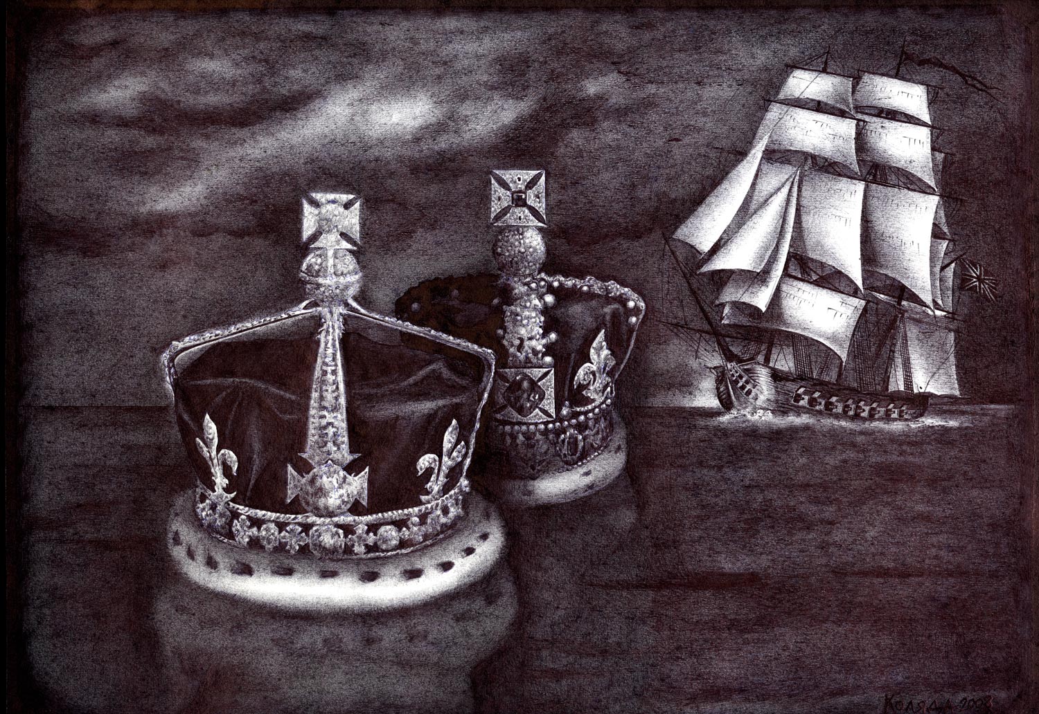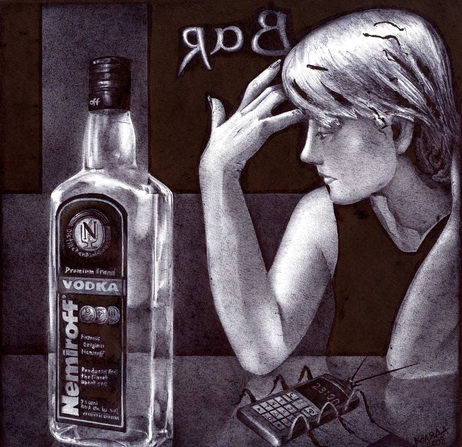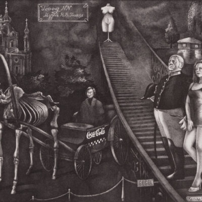…Serhiy Kolyadaの政治的なボールペン画描は、彼の故国ウクライナのギャラリーから疎外されてきた。彼の作品は、主に英語圏のメディアを通して注目され、ほとんどの販売は、サイトの個人閲覧や、オンライン・ギャラリーなどを通した、外国の顧客が中心である。 … Kolyadaの作品では、色を加えるために他の技法を使うこともあるが、主に黒色のボールペンが使われる。2006年には、宗教的なテーマと「生命の神秘的な側面」が彼の主題となった。